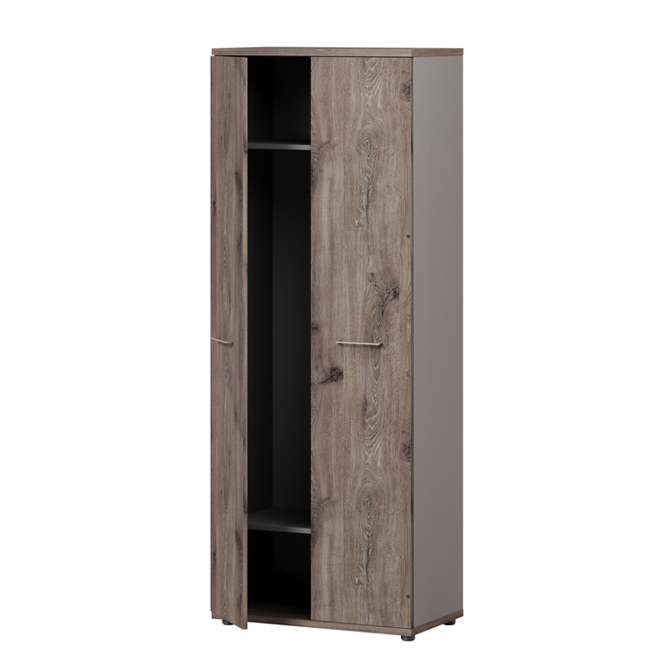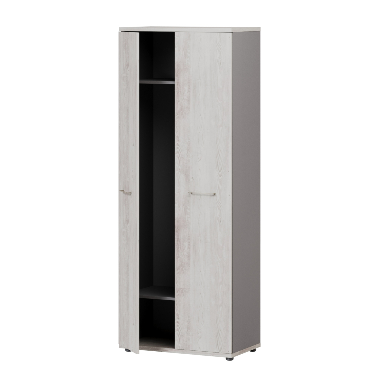 Шкаф имеет 2 полки. Под верхней полкой крепится фронтальная штанга на двух штангодержателях. Полки расположены на расстоянии 377 мм от верхнего и от нижнего топа. Полки выполнены из ЛДСП «Кубанит серый» толщиной 18 мм облицованы кромкой ПВХ 0,8 мм. Размеры: ширина 762 мм, глубина 426 мм.