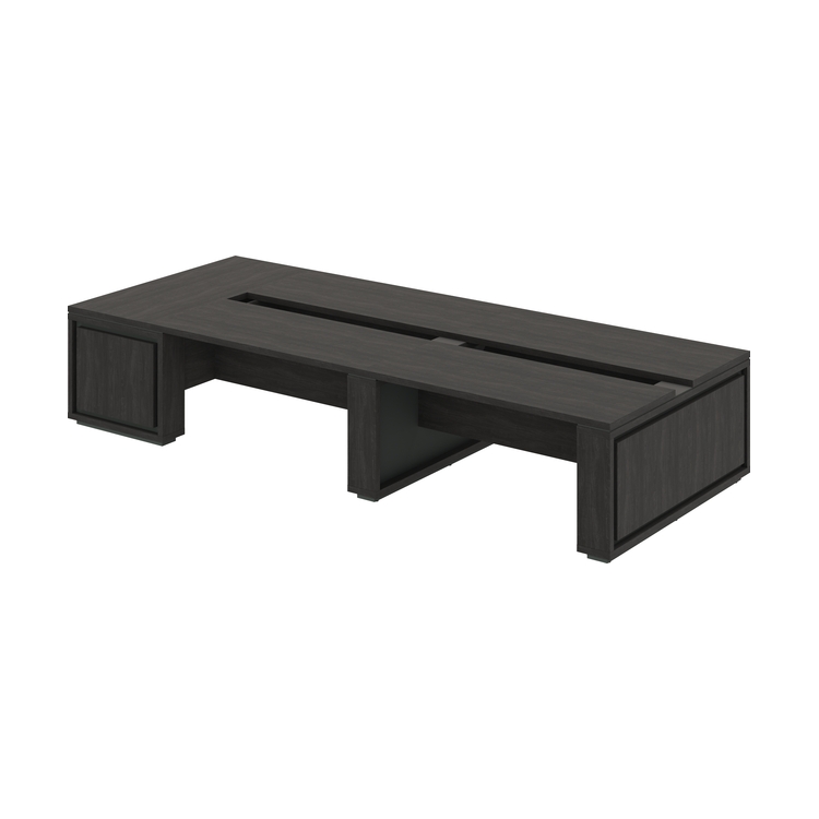 Столешницы, фронтальные панели, верха, низы и бока опор выполнены из ЛДСП Дуб Шерман антрацит 38 мм, облицованы противоударной кромкой ABS 2 мм. Соединители стола выполнены из ЛДСП Дуб Шерман антрацит 18 мм, видимые торцы облицованы противоударной кромкой ABS 0,8 мм. Соединители крайних опор выполнены из ЛМДФ Зеленый камень 18 мм с поверхностью PerfectSense Matt с лицевой стороны. Соединители средней опоры выполнены из ЛДСП Зеленый камень 18 мм. Опоры установлены на цоколя из ЛДСП 38 мм, облицованные противоударной кромкой ABS 2 мм в цвете Зеленый камень. Между столешницами и опорами - проставки из ЛДСП 8 мм, заглубленные на 4 мм от краев столешницы и опор, и, облицованные противоударной кромкой ABS 1 мм PerfectSense Matt.