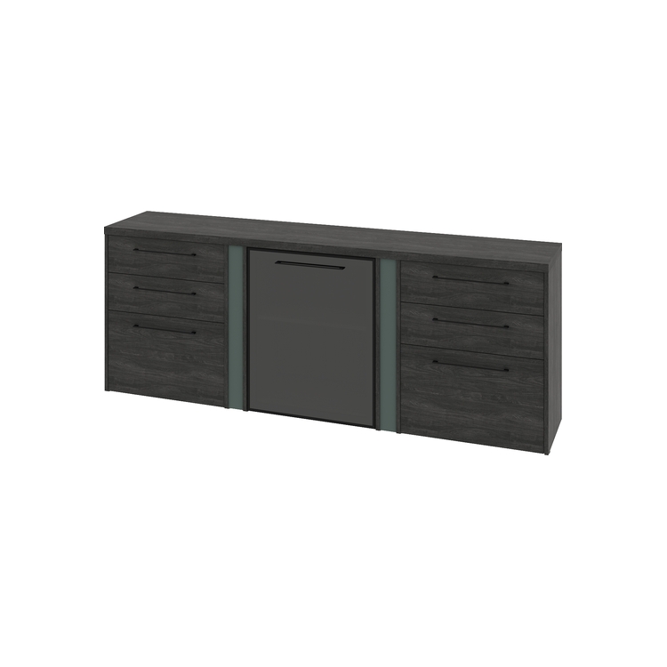 Тумба трехсекционная с левой стеклянной дверью в алюминиевом профиле и 2-мя наборами ящиков (3 ящика в одном наборе). Цвет профиля - черный. Стекло серое.